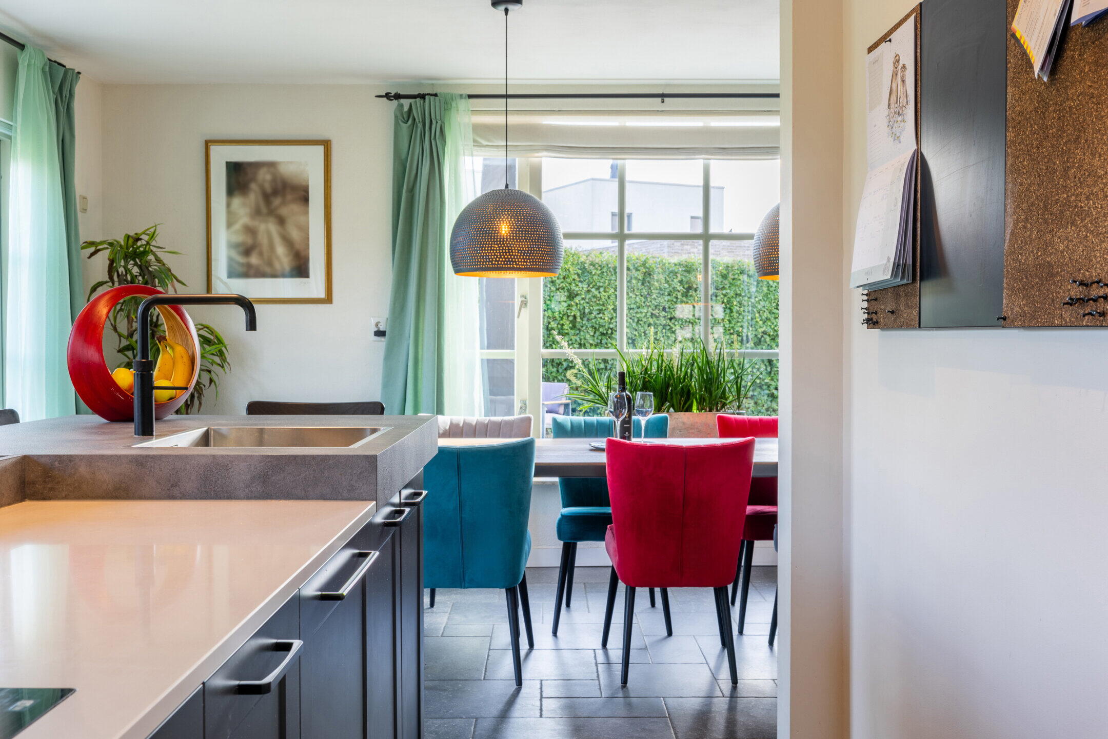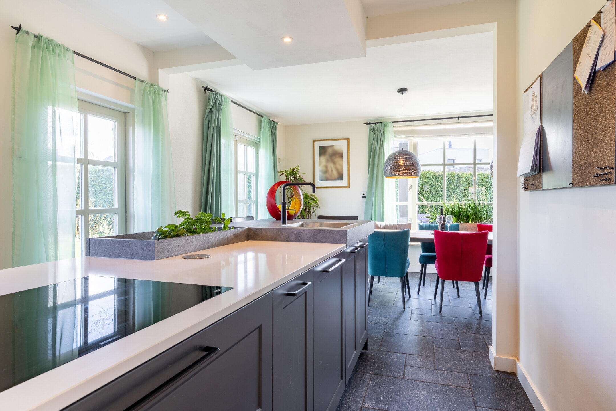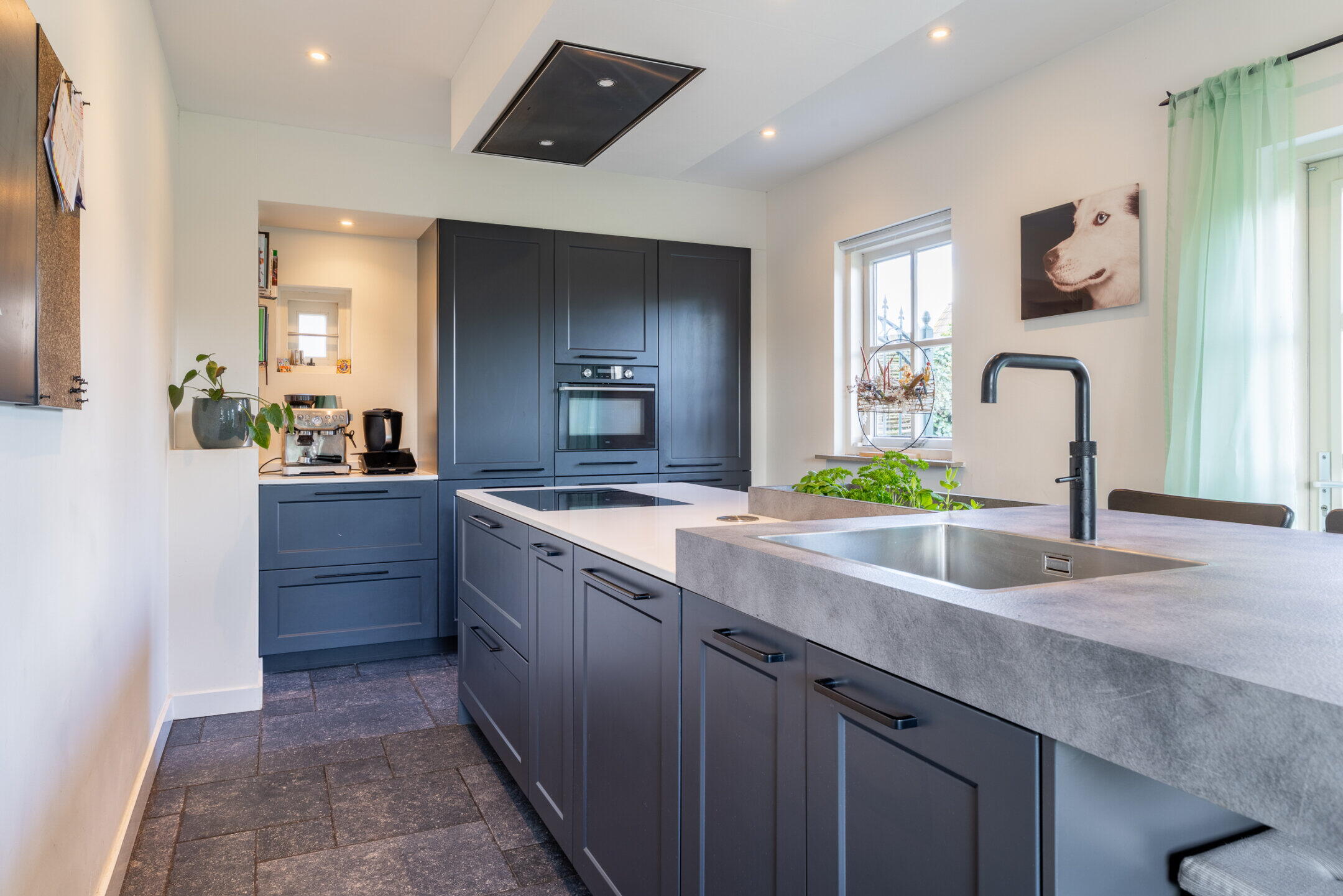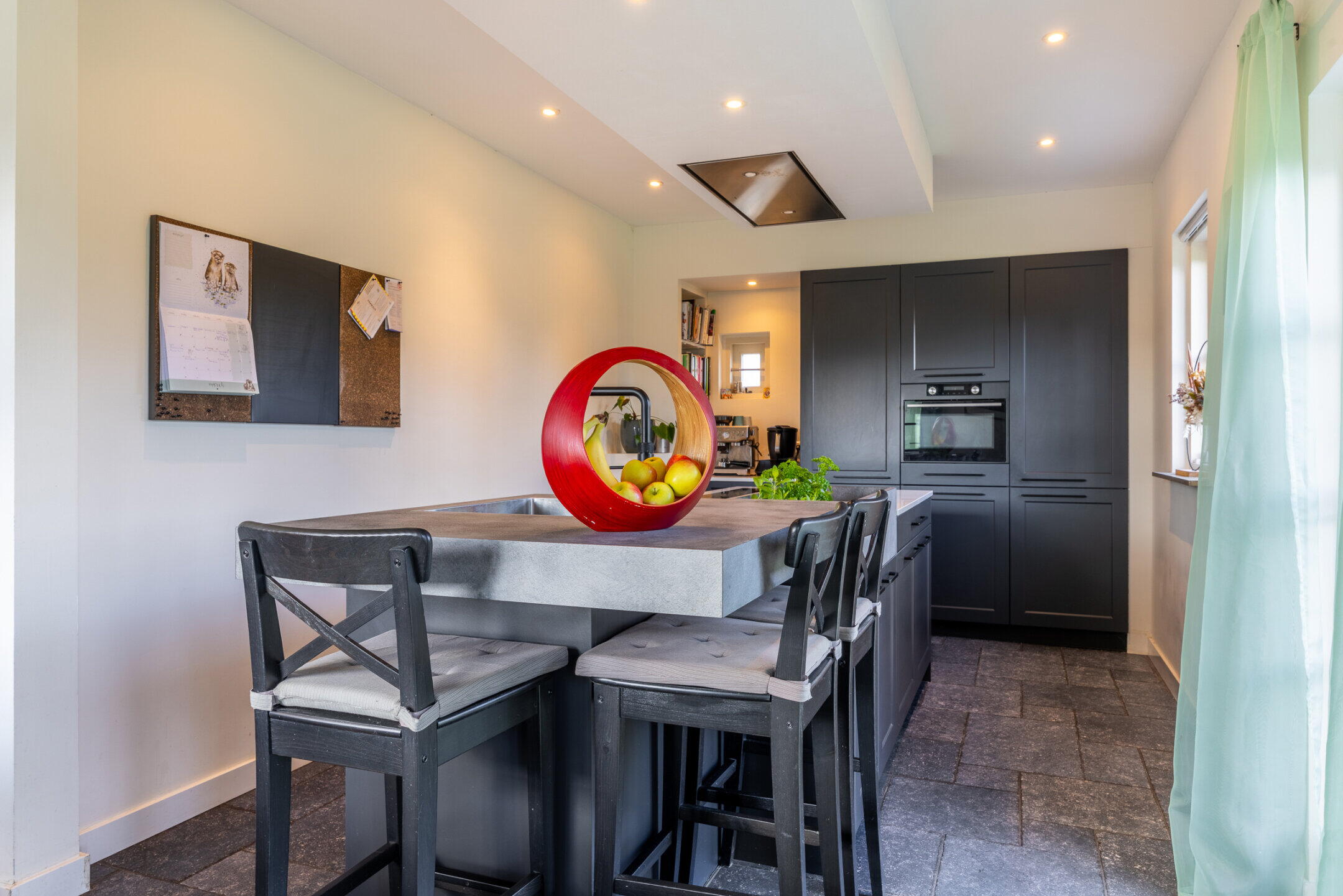 De open woonkeuken (ca. 7.77 x 3.04m) is in 2021 geplaatst en beschikt over een wand- en een eilandopstelling met barfunctie, een composiet werkblad en diverse inbouwapparatuur waaronder een inductiekookplaat met flexzones, plafondelement afzuigkap, Quooker, vaatwasser, combi oven/magnetron, koelkast, vrieskast, veel kastruimte en een grote spoelbak. De keuken is afgewerkt met een nette tegelvloer voorzien van vloerverwarming en geeft zowel middels loopdeur als dubbele openslaande deuren toegang tot de achtertuin.
