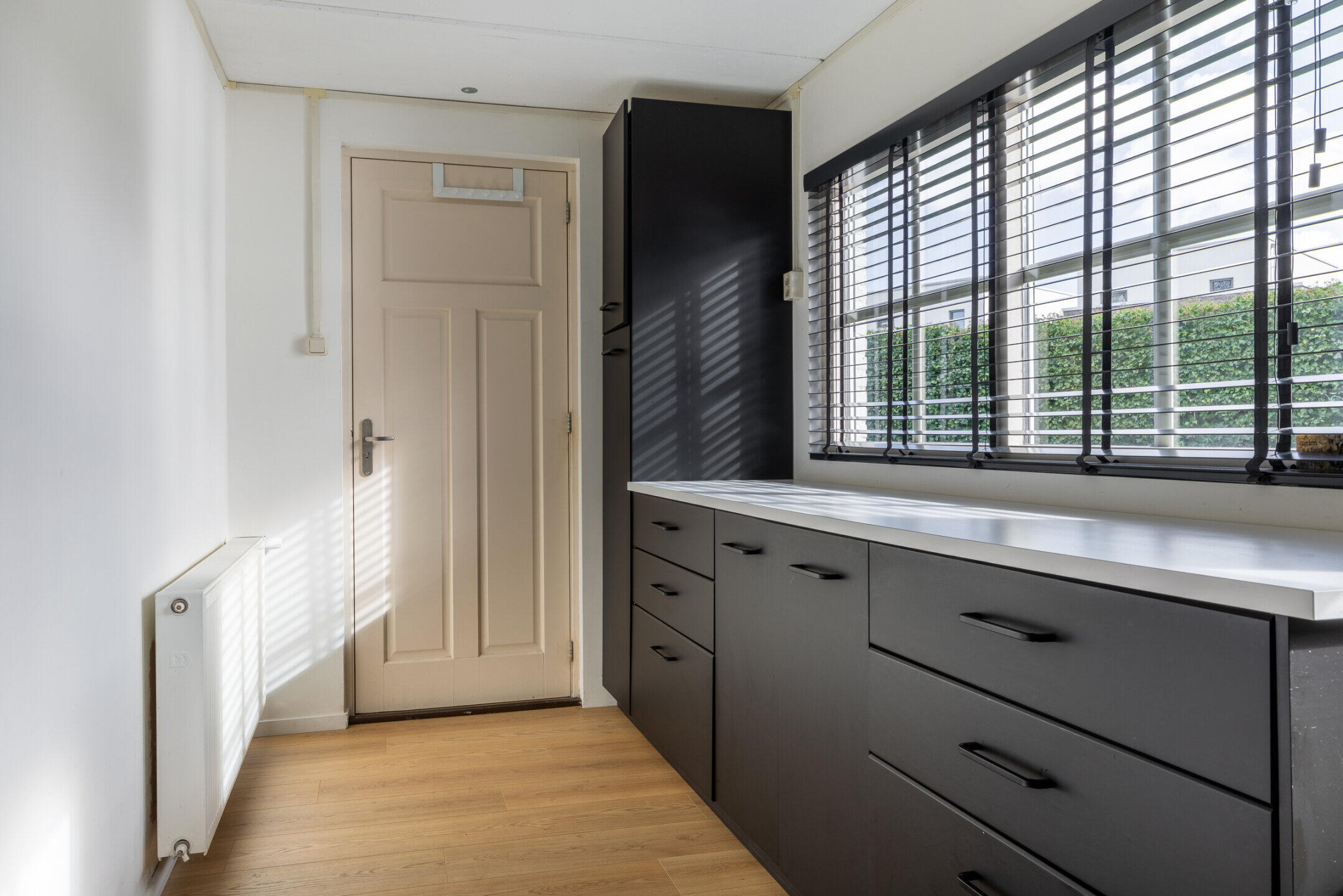 Vanuit de serre is er toegang tot de bijkeuken (ca. 5.48 x 2.02) voorzien van een keukenblok en de aansluitpunten ten behoeve van de wasapparatuur. De bijkeuken geeft toegang tot de garage, de achtertuin, de trapopgang naar de eerste verdieping en de moderne douche en toiletruimte op de begane grond.