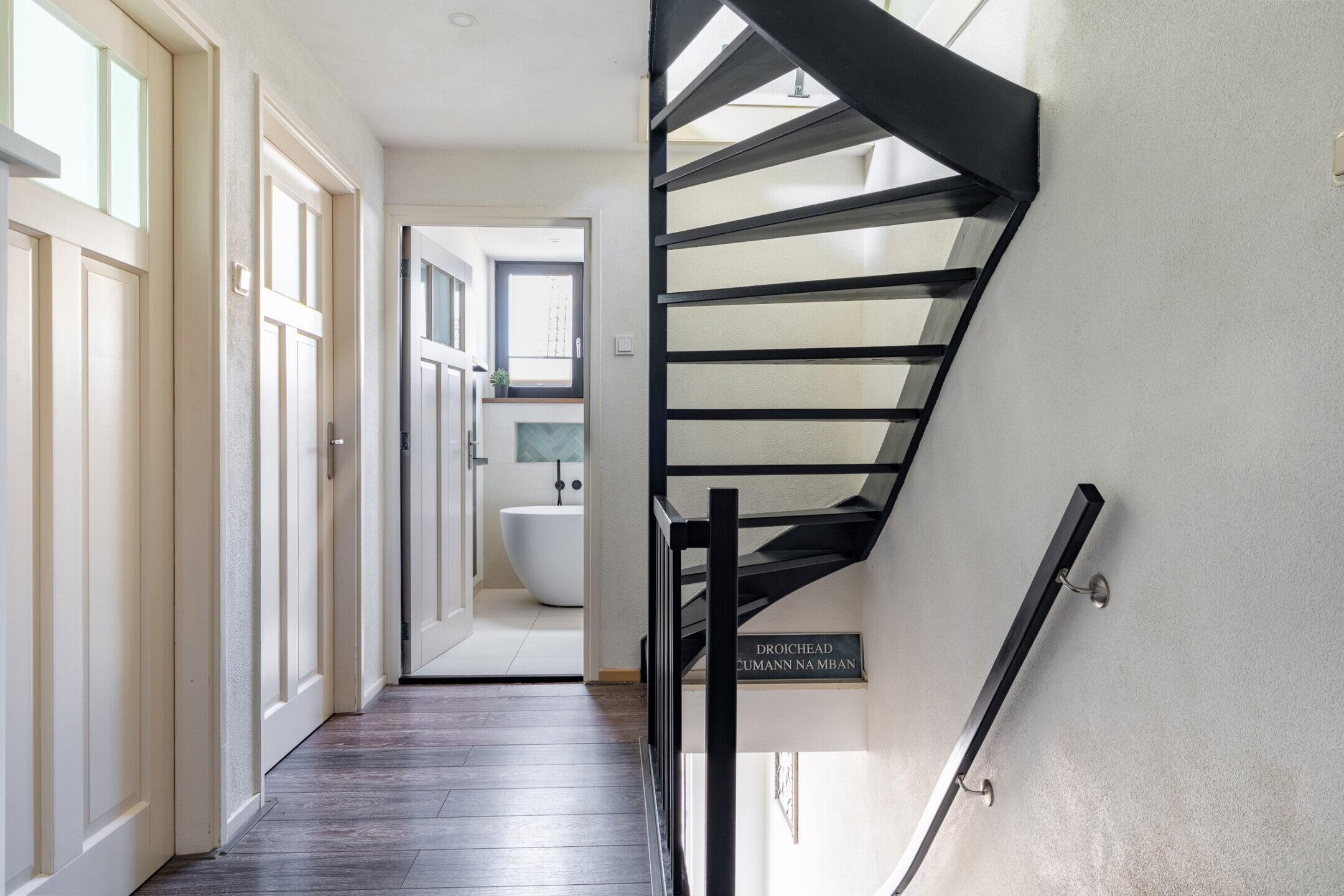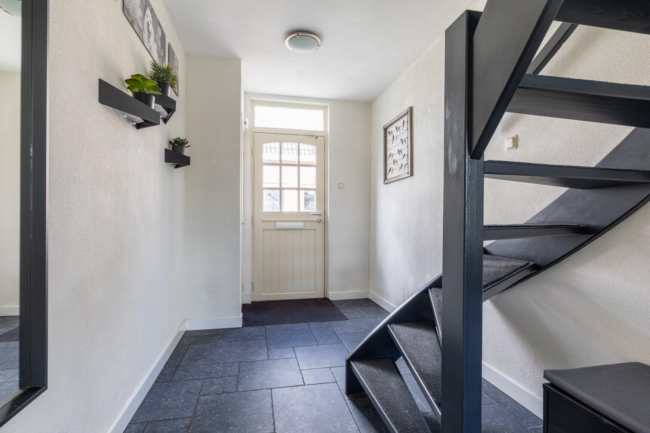 Royale hal (ca. 4.00 x 2.10m) met de trapopgang naar de eerste verdieping, de meterkast (12 groepen en 3 aardlekschakelaars) en toegang tot de woonkamer.