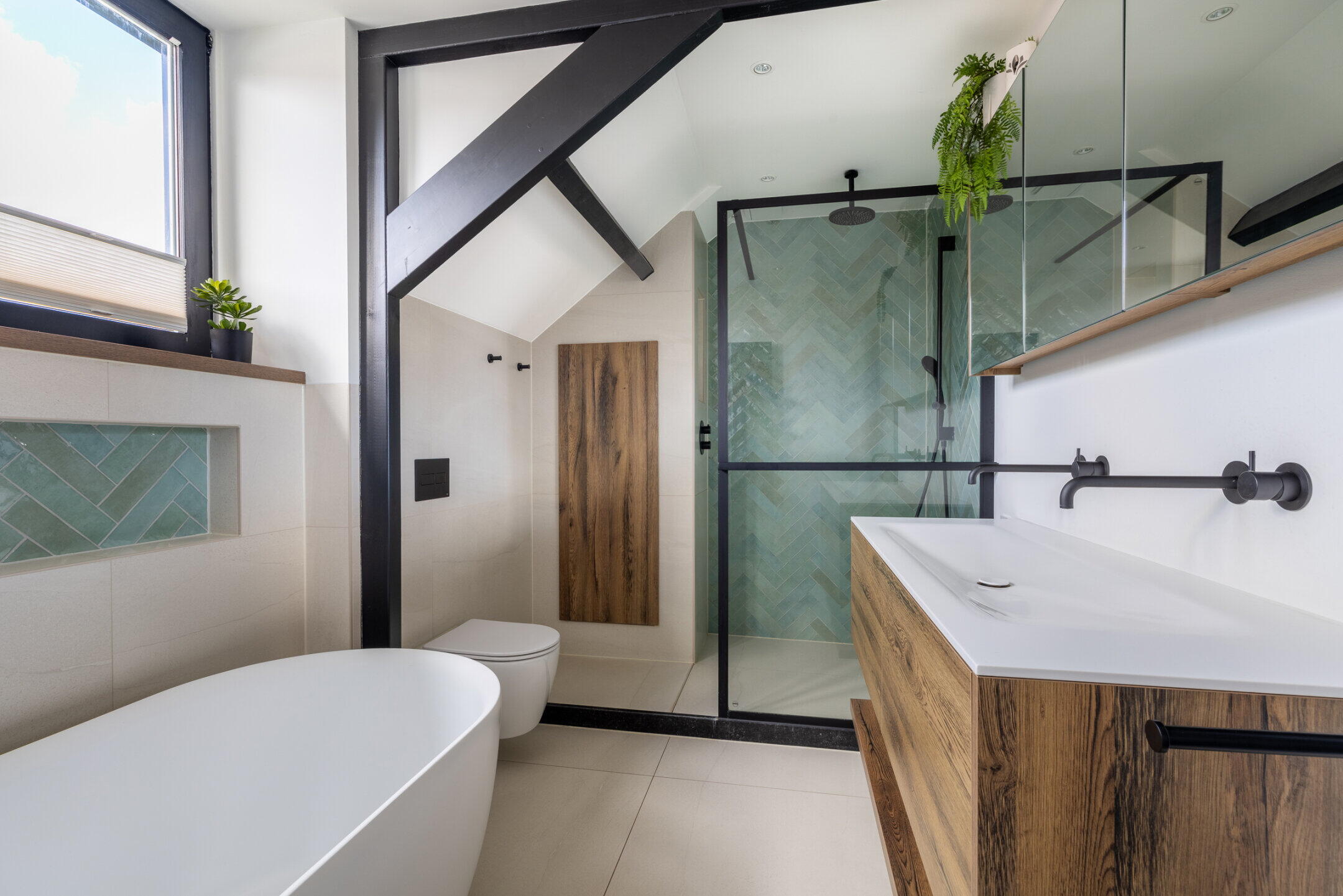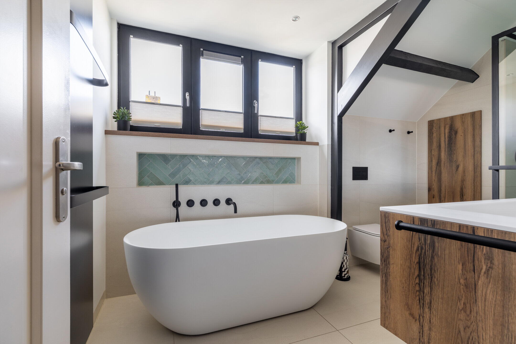 De luxe badkamer (ca. 3.95 x 2.35) is in 2022 geplaatst en beschikt over een royale inloopdouche met hand- en regendouche, een ovaal vrijstaand ligbad, dubbele wastafel in meubel met geïntegreerde bedieningselementen, spiegelkast, diverse handige bergnissen, designradiator, mechanische ventilatie, diverse plafondspots en een moderne vloer- en wandafwerking.