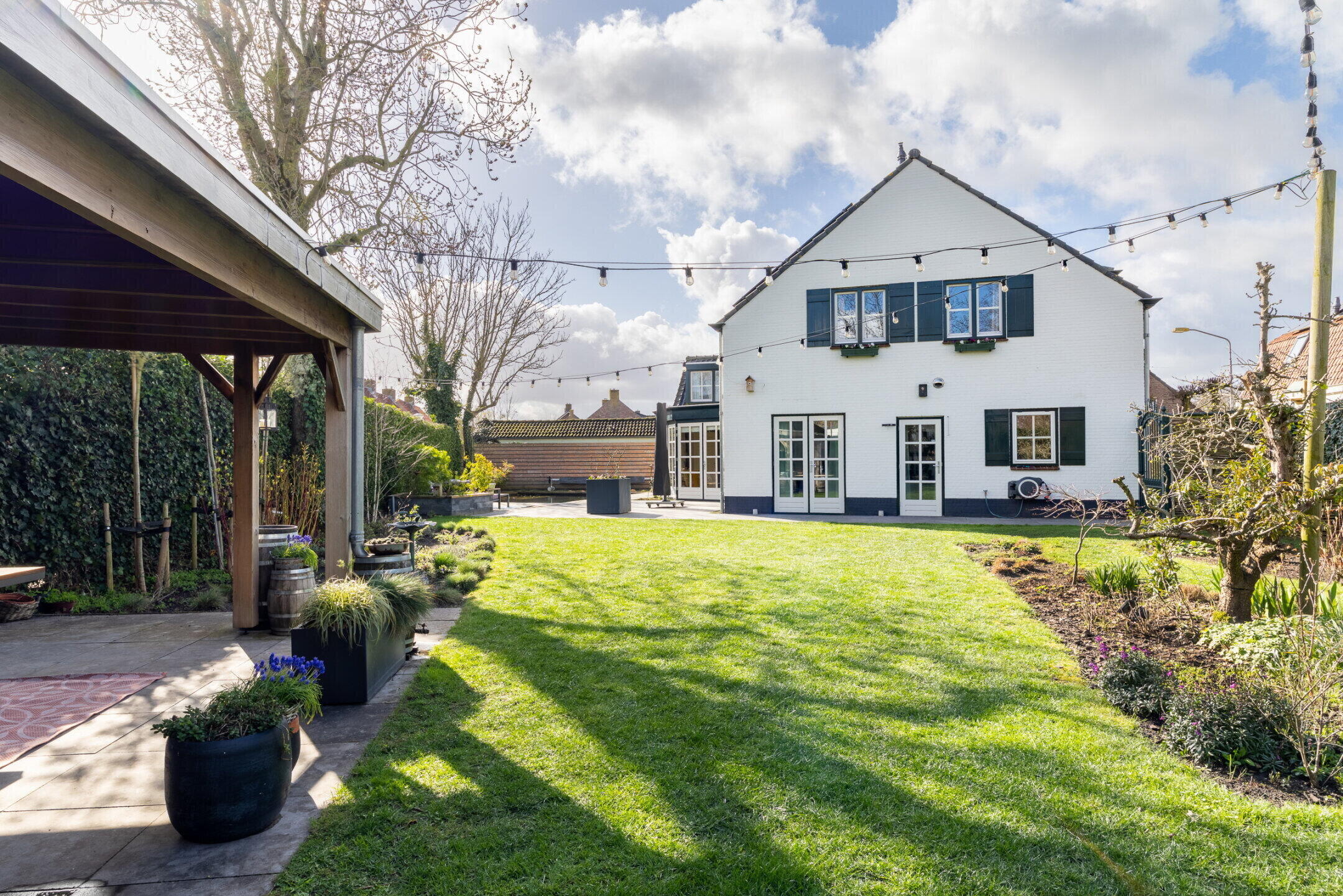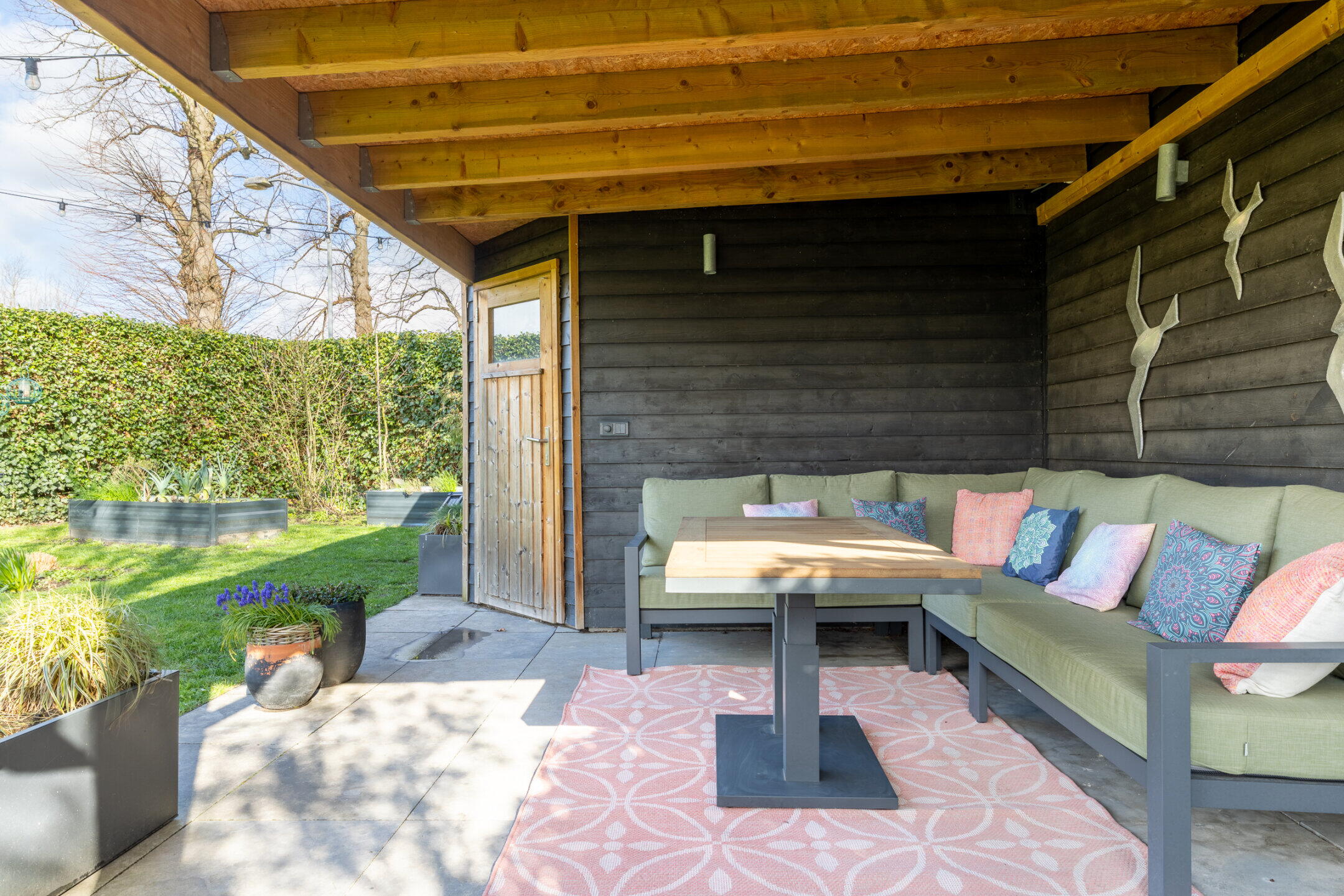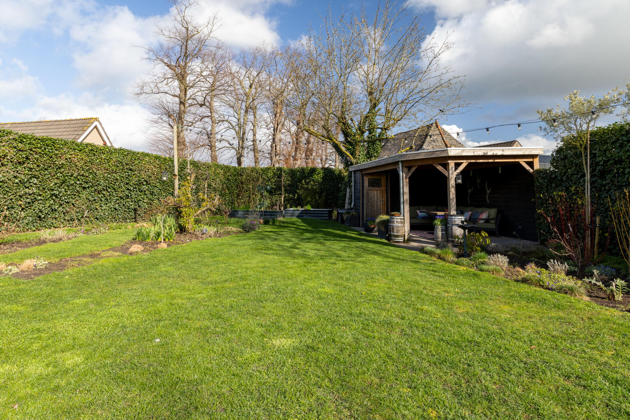 De achtertuin (ca. 40.0 x 14.0m) is fluisterstil, biedt volop privacy mede door de hoge heg rondom en voorts voorzien van een gazon, diverse terrassen, borders met een gevarieerde beplanting, een volwassen bomenstand, verlichting, een buitenkraantje, berging, een sfeervolle overkapping/loungehoek (ca. 4.40 x 3.45m) met verlichting en een moderne vloertegel, een poort aan zowel voor als achterzijde en een verwarmd natuurzwembad (ca. 7.5 x 6.0m).